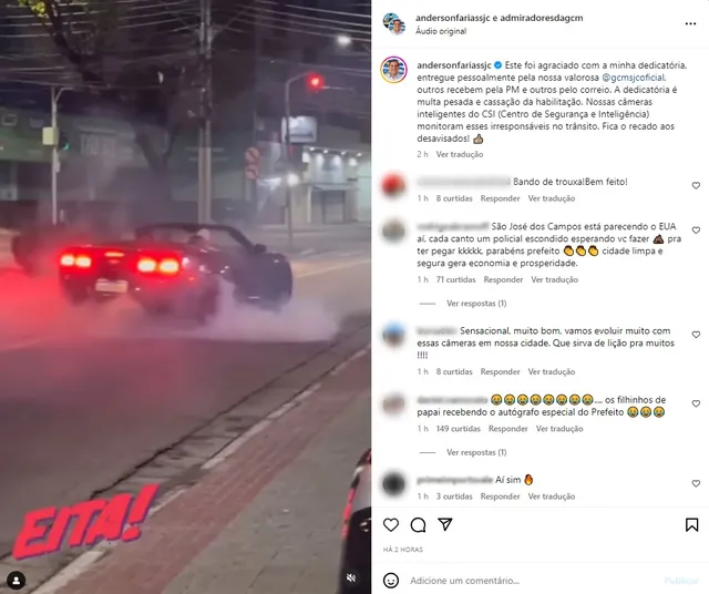 Um carro conversível foi multado pela Guarda Civil Municipal de São José dos Campos por fazer a manobra perigosa de queimar pneus na avenida Nelson D’Ávila, na