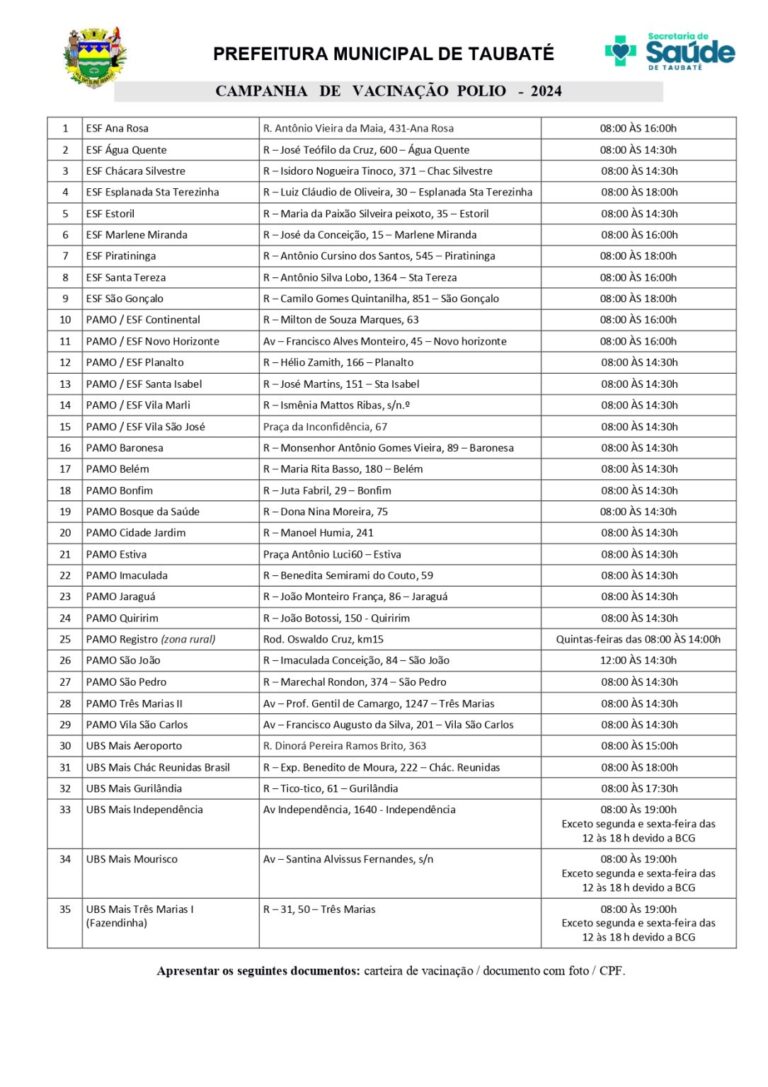 A Prefeitura de Taubaté inicia nesta terça-feira, 4, a Campanha Nacional de Vacinação contra a Poliomielite, que vai até o dia 14 de junho, em