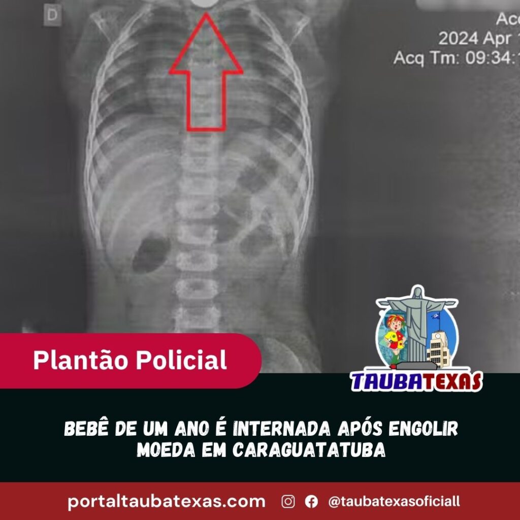 Uma bebê de apenas um ano foi hospitalizada em Caraguatatuba (SP) após engolir uma moeda, necessitando de internação. Na segunda-feira (15), a criança foi transferida para um hospital em São Paulo, onde passará por uma endoscopia para a remoção do objeto.