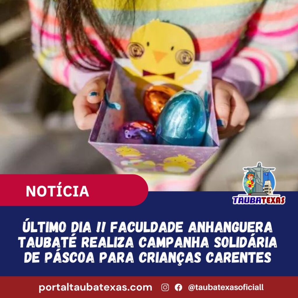 A Faculdade Anhanguera Taubaté está promovendo uma campanha solidária de Páscoa, com o objetivo de arrecadar chocolates para distribuir a crianças carentes de projetos sociais no Vale do Paraíba. As doações podem ser feitas até esta quinta-feira (28), das 8h às 20h, na portaria da faculdade, localizada na avenida Charles Schneider, n° 585. A iniciativa foi idealizada pelo professor do curso de Ciências Contábeis, Maurício Guerreiro, em colaboração com os alunos das atléticas e a CIPA (Comissão Interna de Prevenção de Acidentes) da instituição. Diversos tipos de chocolate são aceitos, desde caixas até os tradicionais ovos de Páscoa. Até o momento, a campanha já arrecadou 150 chocolates, segundo informações da faculdade. Entre os projetos sociais beneficiados está o Grupo Bravos, localizado em Pindamonhangaba.