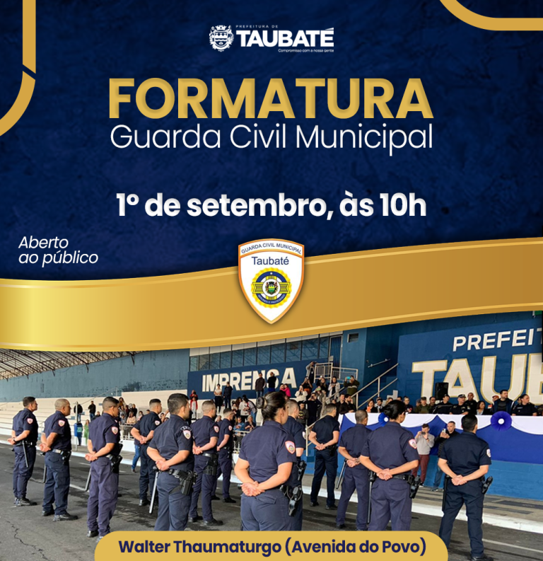 A Prefeitura de Taubaté promove dia 1º de setembro, às 10h, evento de formatura da 7ª Turma do Curso de Formação de Guarda Civil Municipal. A cerimônia, aberta à população, será realizada na avenida Walter Thaumaturgo (Avenida do Povo).