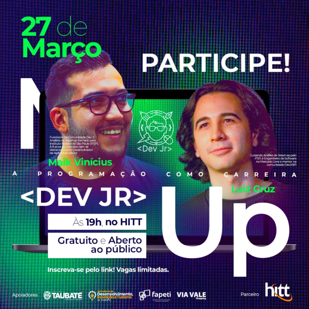 No dia 27 de março, às 19h, a DevJr BR, comunidade com o objetivo de contribuir com a carreira do iniciante em programação, estará no Hub de Inovação Tecnológica de Taubaté (HITT) para abordar alguns tópicos essenciais que irão moldar os próximos passos.